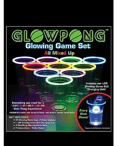 Game on, glow on and get your drink on with the Glow Pong Mixed Competition Game Set. This glow in the dark set takes your pong skills and popularity to a whole new level. With 24 cups that light-up in 7 different colors everyone is coming to your dorm room or place to play pong.