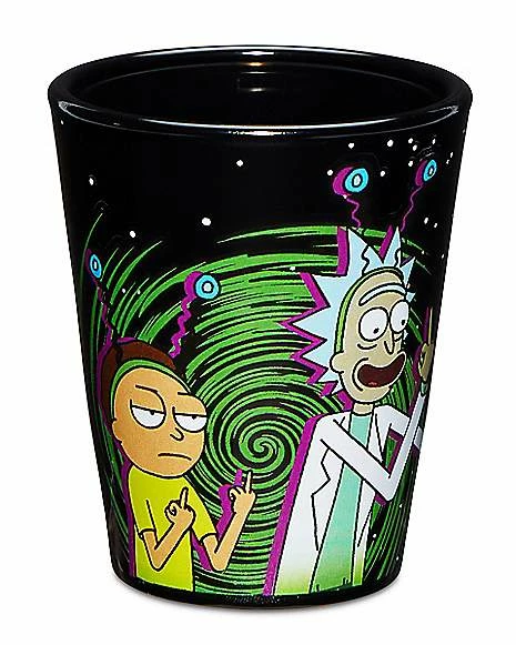 Celebrate your favorite animated TV show with this official Peace Among Worlds Rick and Morty Shot Glass! This black shot glass features Rick and Morty giving the finger.